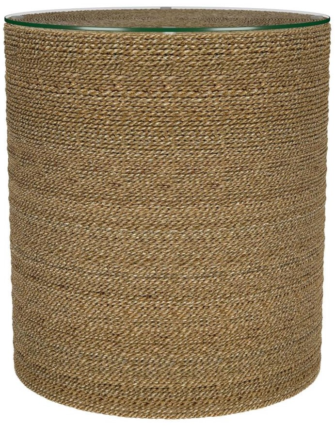 Wrapped in handwoven seagrass, this round accent table adds organic warmth to any living room. A clear tempered glass top offers a smooth, functional surface while revealing the textured beauty beneath. Its cylindrical form is supported by a durable plywood frame and finished in a light natural tone.Read More